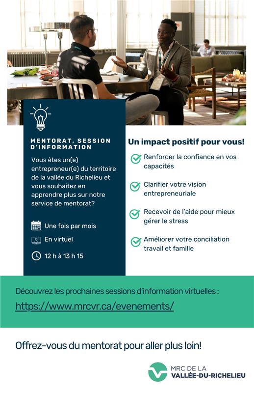 Ne manquez pas notre prochaine session virtuelle, animée par Gilles, pour en apprendrez plus sur le mentorat, un service offert par la MRC de La Vallée-du-Richelieu.