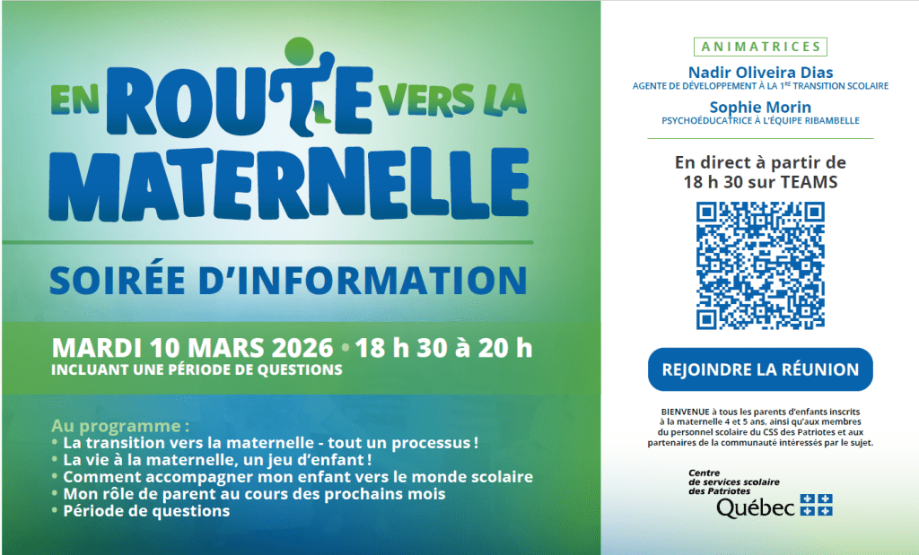 Pour plus d’infos : Soirée d’information : Bien se préparer pour l’entrée de son enfant à la maternelle | Centre de services scolaire des Patriotes